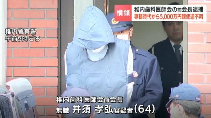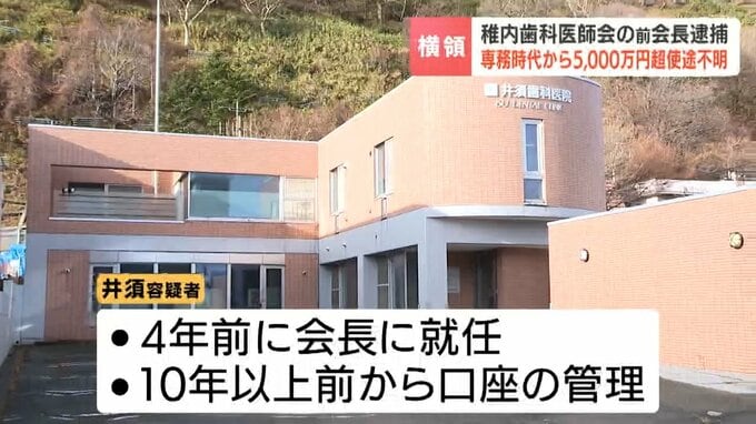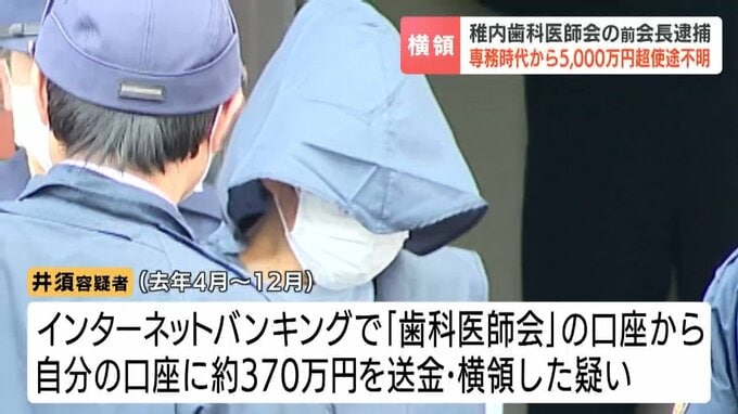 歯科医師会によりますと、井須容疑者は4年前に会長に就任し、2月に不正が発覚して解任されましたが、専務理事時代の10年以上前から歯科医師会の口座を管理していて、これまでに使途不明のやり取りは5000万円を超えるということです。