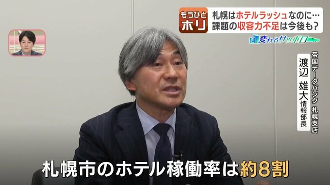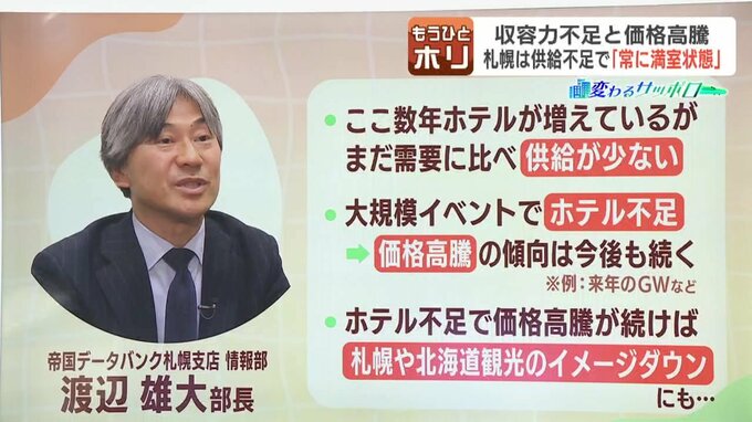 帝国データバンク札幌支店の渡辺雄大部長に聞きました。ここ数年、ホテルは増えているのは間違いないが、需要に比べ供給が少なく、一気に解消するのは現実的ではない。イベントが重なると、価格も高騰する傾向は今後もつづく。