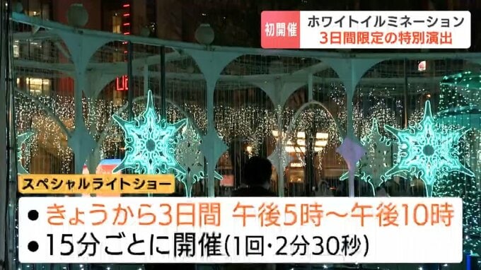 ひと足早くクリスマス気分が味わえるスペシャルライトショーは、5日からの3日間、午後5時から午後10時まで15分ごとに開催されます。