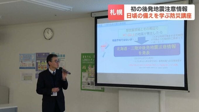 「すぐ逃げられる準備を」初の“後発地震注意情報”日頃の備えを学ぶ防災講座に市民が参加「家族や周りの人にも伝えたい」札幌管区気象台 2025年12月11日(木) 17:58 国内 現在、発表されている「北海道・三陸沖後発地震注意情報」について学ぶワークショップが11日、札幌市で開かれました。・気象台のスタッフ「これからどんな準備が必要か書いてみて下さい」札幌管区気象台の職員が講…