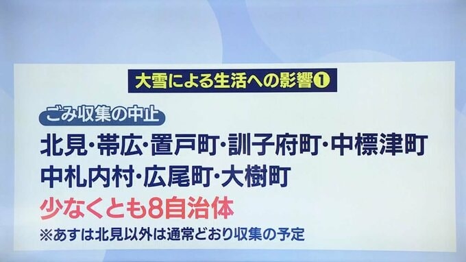 【北海道・冬の嵐】 16日以降もゴミ収集、郵便や宅配便の集配、スーパーなど流通への影響が残る見込み 15日午後5時時点でのまとめ 2025年12月15日(月) 17:27 国内 北海道では、大雪などで生活への影響もでています。15日は、北海道北見市や帯広市、置戸町、訓子府町、中標津町、中札内村、広尾町、大樹町など、少なくともの8つの自治体でごみの収集を中止しました。このうち、…