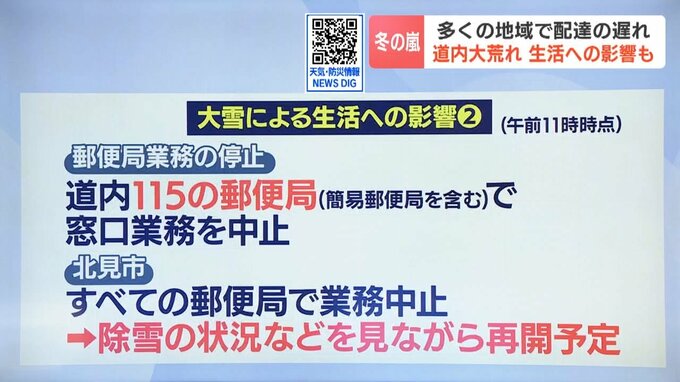 日本郵便は除雪の状況などをみながら再開させるとしていますが、現時点で再開の見通しはたっていません。