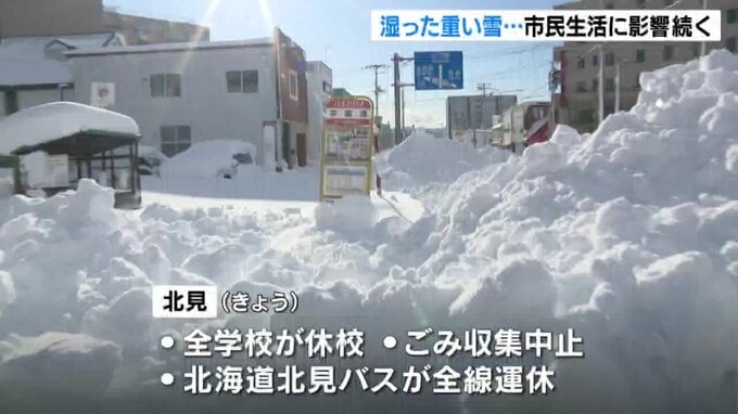 北見市では道路の除雪が追いつかず、16日も市内のすべての学校が休校し、北見市内と留辺蘂地区ではごみの収集が中止になったほか、市内を走る路線バスも全線で運休しています。
