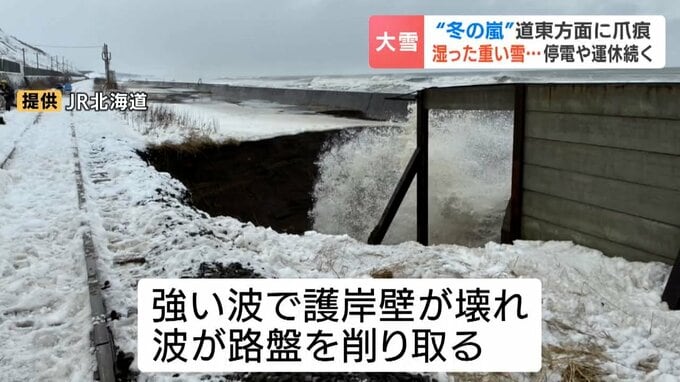 原因についてJR北海道は、強い波で護岸壁が壊れ、波が路盤を削り取ったとみています。