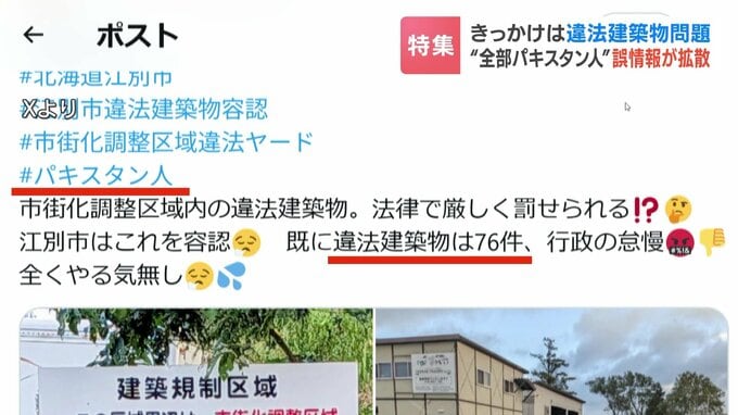 「江別市議会の動画では(違法建築が)『角山で76件』と言う表現に感じた。『角山に76件あるとすれば全てパキスタン人のものだろう』と誤解していた」