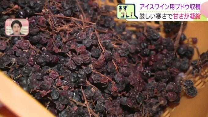 凍てつく寒さの中、1房ずつ手作業で収穫されるのは凍ったままのブドウです。