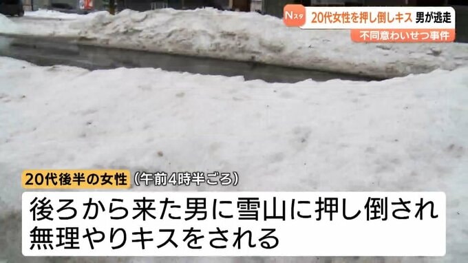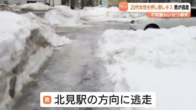 21日午前4時半ごろ、北見市美芳町7丁目の歩道で1人で、歩いていた20代後半の女性が後ろから来た男に両肩を押され、雪山に倒されました。