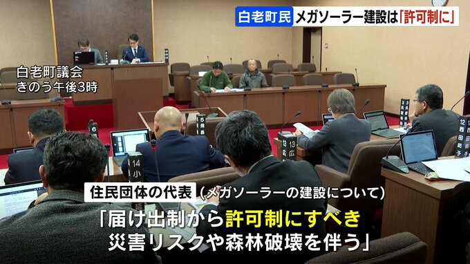 町は現在、メガソーラーの建設を事業者側からの届け出制としていますが、住民団体の代表は22日開かれた町議会の連合審査会で、条例で「許可制」にすべきだとの陳情書を読み上げました。