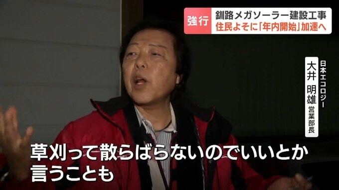 「どうして今月中に着工しなきゃいけないのかの質問に対し(日本エコロジーは)『とにかく今月中に着手しなければいけない』という、会社都合の話だけ一方的に来た。条例の変更前に1つでも手を付けたいがための草刈りとしか思えない」