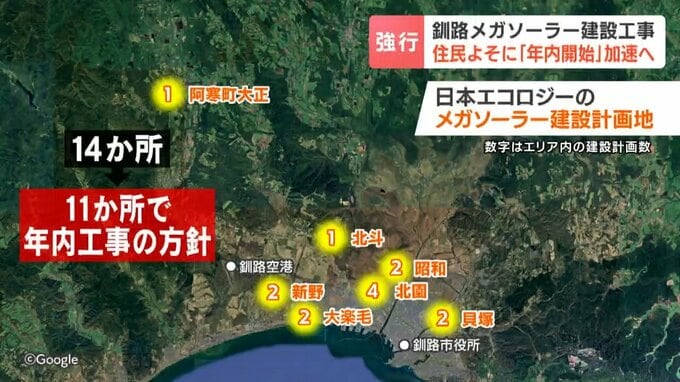 釧路湿原周辺でのメガソーラーの建設計画が中断している大阪の事業者が、市の条例で「届け出制」から「許可制」となる2026年1月を前に、10か所余りの計画地で工事を開始する方針を示し、一部の地域の住民から反発の声があがっています。