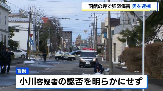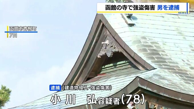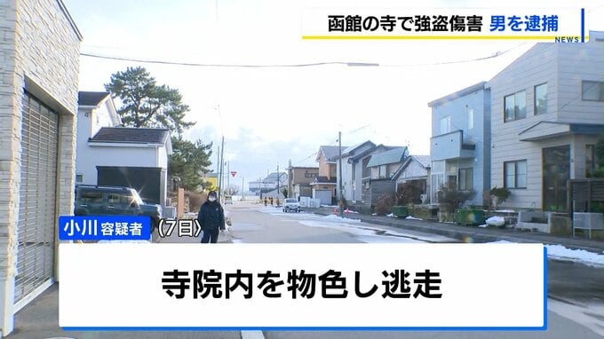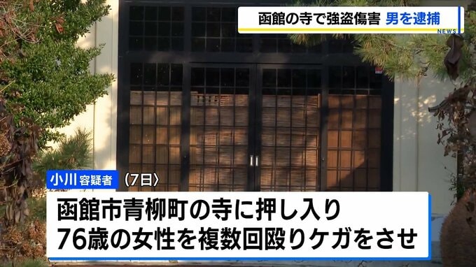 小川容疑者は、7日、函館市青柳町の寺に押し入り、事務員の76歳の女性の頭を木刀のようなもので複数回殴りけがをさせたうえ、寺院内を物色し逃げた疑いが持たれています。
