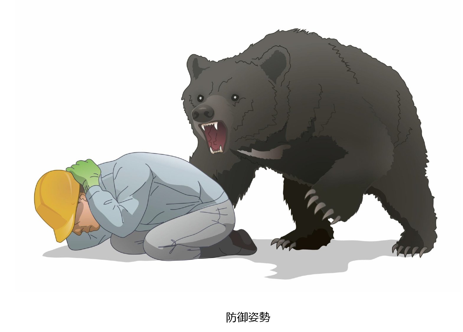 「クマは追跡本能があって走っていくものを追いかける習性があるので、我慢してゆっくり後ずさる。クマは相手が反撃してこないことがわかると去っていくため、それまでこの姿勢で我慢することが重要」