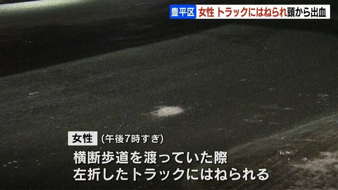 6日午後7時すぎ、横断歩道を渡っていた女性が、左折してきたトラックにはねられました。