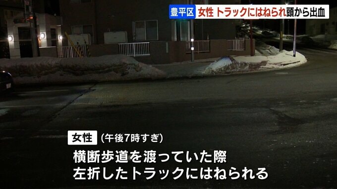 6日夜、札幌市豊平区の交差点で、横断歩道を渡っていた成人女性がトラックにはねられ、けがをしました。