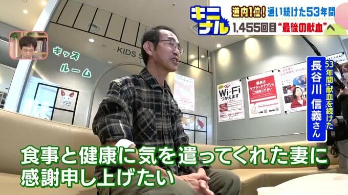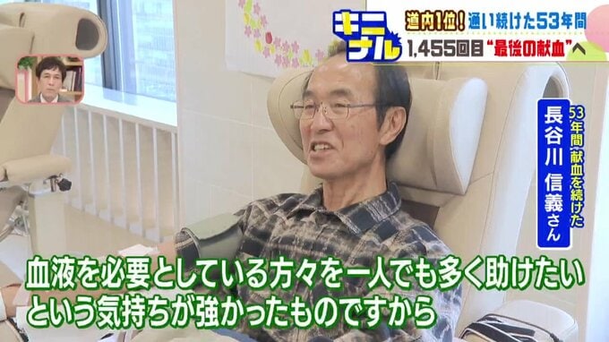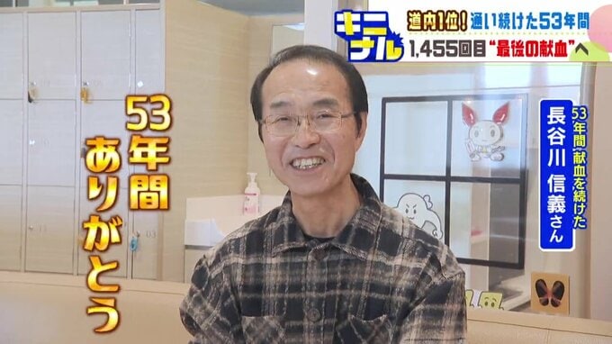 長谷川さんは、1月5日に70歳の誕生日を迎えました。17歳から53年間、献血をしてきて最後の献血が1455回目でした。