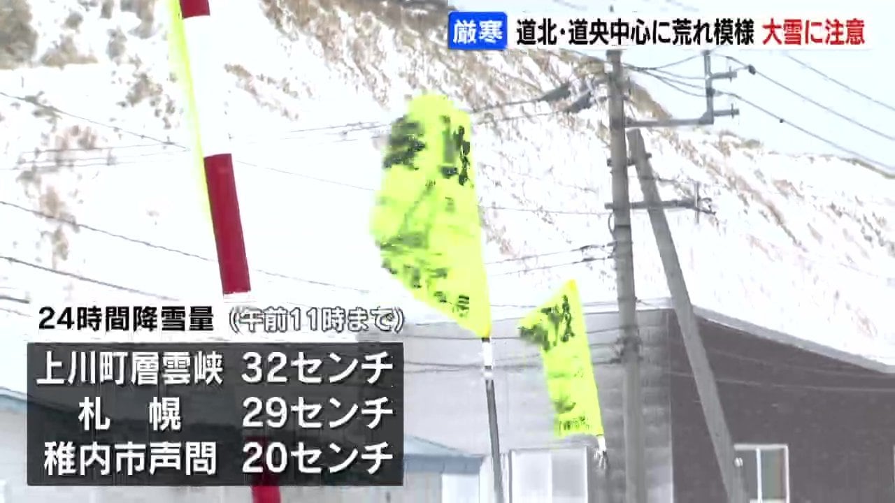 発達した低気圧が北海道付近を通過した影響で、8日の道内は冬型の気圧配置となり、午前11時までの24時間に上川町層雲峡で32センチ、札幌で29センチの雪が降りました。