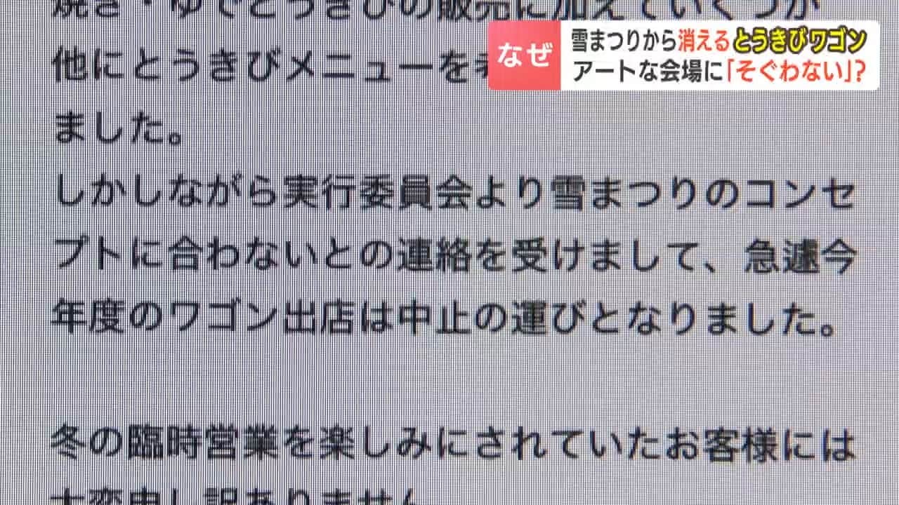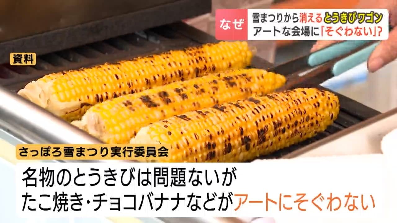 「2月から始まるさっぽろ雪まつりですが、6丁目会場で出店されていたとうきびワゴンが今年見送られるということです」
