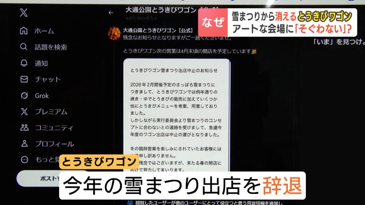 2月から始まるさっぽろ雪まつりで、20年近く親しまれてきた「とうきびワゴン」が、2026年出店を取り止めました。実行委員会が「会場のコンセプトに合わない」と業者に伝えていました。