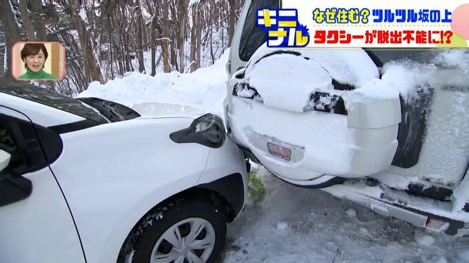 40分後…要請した車がやってきたんですが、タクシーをけん引しようとした車も滑ってしまい、なんとタクシーにぶつかってしまいました。