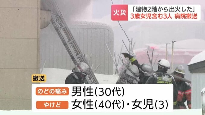 警察などによりますと出火当時、住宅には7人がいて、このうち30代の男性がのどの痛みで、40代の女性と3歳の女の子は手や足の裏にやけどをしてそれぞれ病院に運ばれました。命に別状はありません。