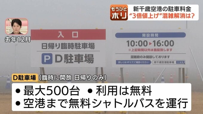 そして、さらなる混雑緩和と利便性向上を目指し、12月末には空港ターミナルから1キロほどの場所に、日帰り専用のD駐車場が完成。