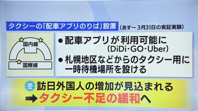 1月15日から3月31日までの実証実験ですが、国内線2か所と国際線1か所にタクシーの「配車アプリのりば」が新たに設置されます。