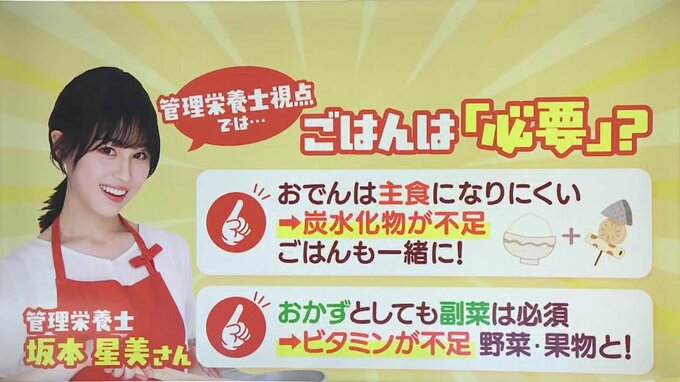 管理栄養士の坂本星美さんによりますと、おでんはたんぱく質や食物繊維を多く摂れる優秀な食事だそうです。