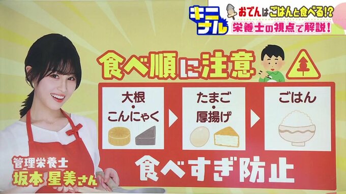 さらに、食べる順番ですが、「大根・こんにゃく→卵・厚揚げ→ごはん」だと、満腹感が高くなって、食べすぎや、血糖値上昇も抑えられるということです。