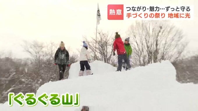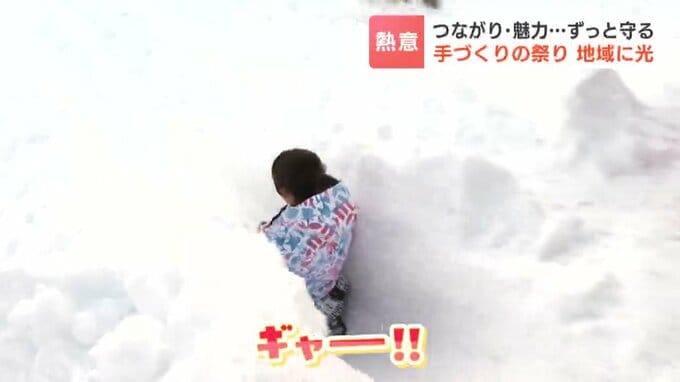 みんなに大人気の巨大滑り台に、思わず顔を出したくなる窓つきのかまくらも…地元の有志たち約20人が2日がかりで作ったものです。