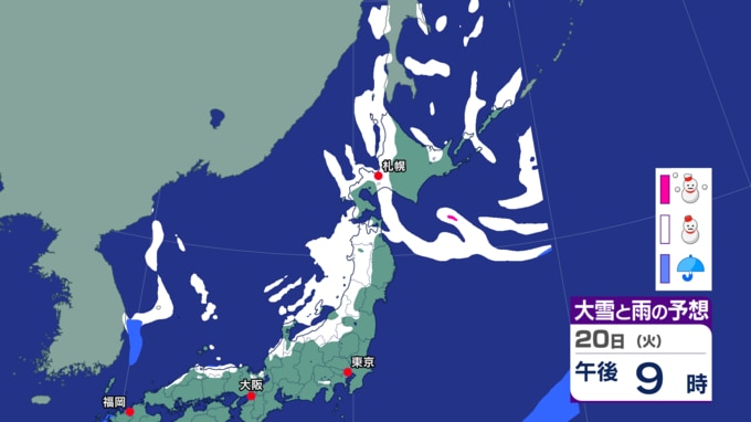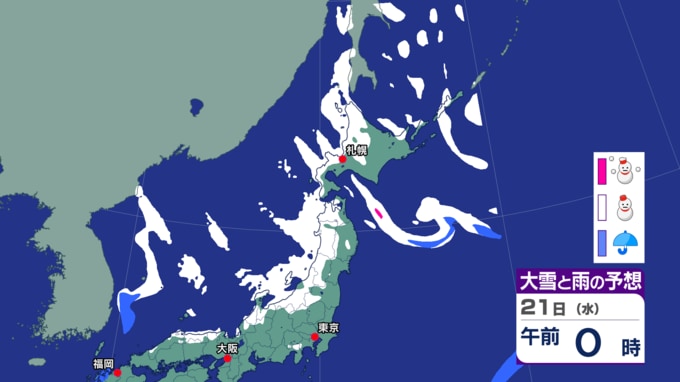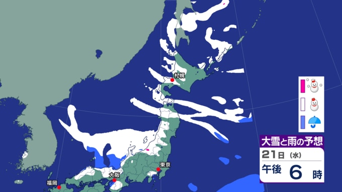 20日18時から21日18時までに予想される24時間降雪量は多い所で、