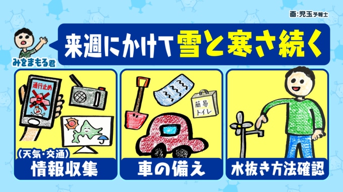 【気象解説】寒波の影響で北海道でも警報級の大雪に 21日にかけて最大50センチの降雪予想 立ち往生に備えを 水道凍結にも注意 2026年1月20日(火) 20:18 国内 天気 児玉晃 大雪による立ち往生や水道凍結にも備えを! ▼雪と雨の予想シミュレーション(21日)(22日)(23日) 上空の強い寒気は来週にかけて居座り、雪と寒さが長く続きます。天気や交通情報をこまめに確認しましょう。 大雪による立往生に備え、車にスコップやスノーヘルパー、携帯トイレも積んでおくと安心です。 水道凍結のおそれもあるため、水抜きの方法を確認しておきましょう。