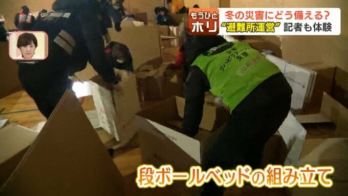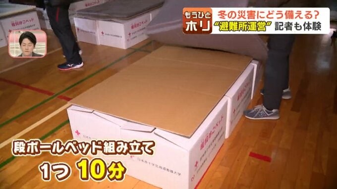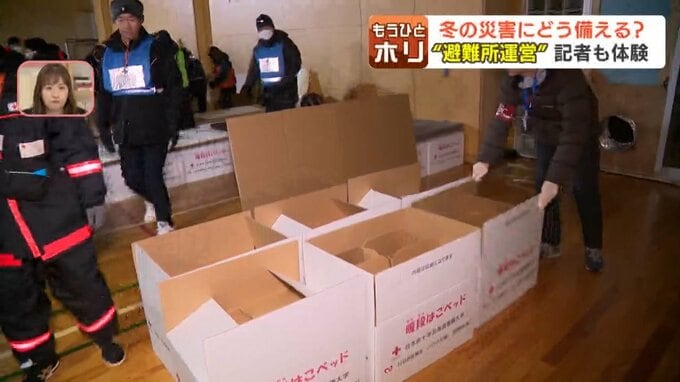 続いては、多くの自治体が導入を進めている「段ボールベッド」の組み立てです。HBCの記者も作業に参加します。