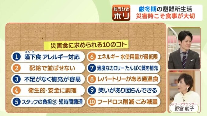 厳冬期の防災に詳しい根本教授は、災害食に求められる10のポイントを挙げています。