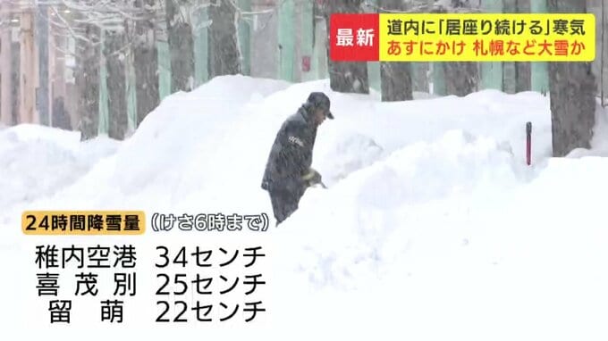 21日午前6時までの24時間に降った雪の量は、稚内空港で34センチ、喜茂別町で25センチ、留萌市で22センチなどとなりました。