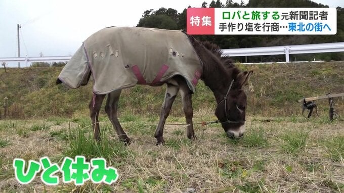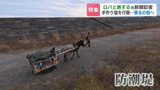 ロバのクサツネと歩く海岸沿いの道。すぐ横には高い防潮堤が続き、海と陸を隔てています。