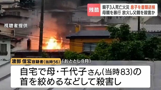 室蘭市絵鞆町3丁目の渡部信宏容疑者(当時56)は、2024年8月、自宅で母親の千代子さん(当時83)の首を絞めるなどして殺害したうえ、灯油をまいてライターで火を放ち、父親の清秋さん(当時83)を殺害した疑いが持たれています。