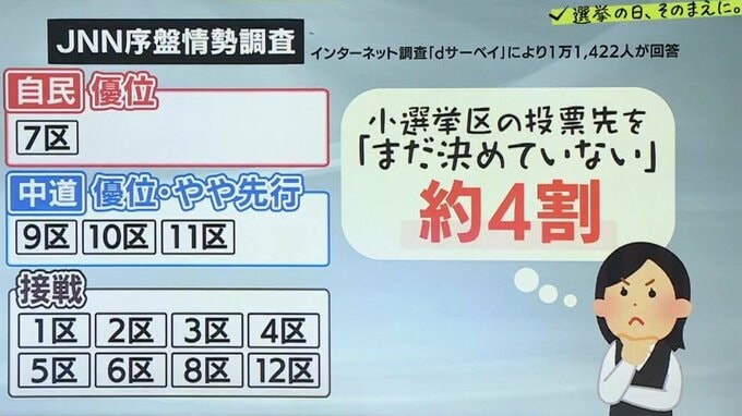 JNNは、1月28日と29日に行ったインターネット調査に、取材を加味して、衆議院選挙の序盤の情勢を分析しました。北海道1区から12区までの序盤の情勢です。