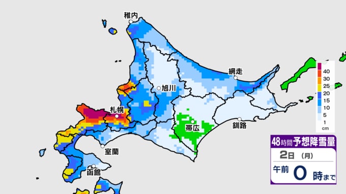 札幌周辺で、土曜日は10~20センチ、日曜日も20センチ前後の雪が降るでしょう。土日のトータルで30センチ以上に達するおそれがあります。