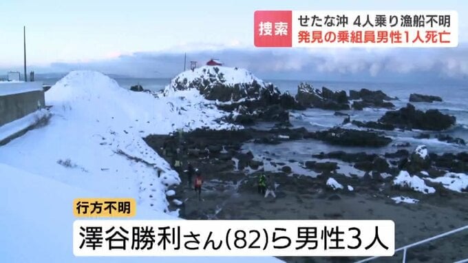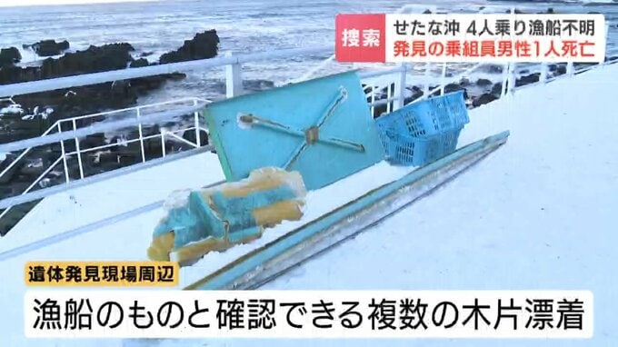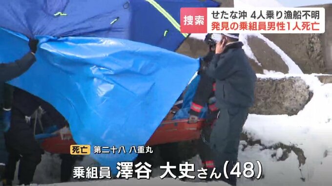 男性は29日から行方が分からなくなっていた4人乗りの漁船の乗組員で、48歳の男性と確認されました。残る3人の行方はわからないままで捜索が続いています。