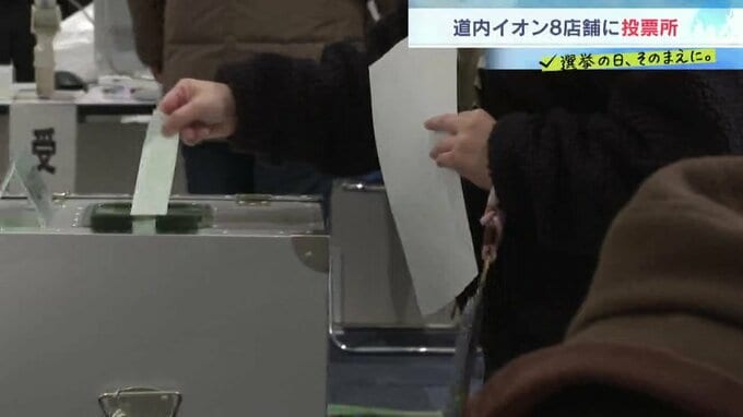 選挙の日、そのまえに。 【衆議院選挙2026】買い物ついでに一票 道内8店舗のイオンに期日前投票所「すごく便利」函館・釧路は当日投票も可能 2026年1月31日(土) 18:41 国内 2月8日投開票の衆議院選挙で、北海道8か所のイオンの店舗内に、期日前投票所が設置されます。苫小牧市のイオンモール苫小牧には、31日から期日前投票ができる投票所が設置されました。イオン店舗内の投票所は、道…