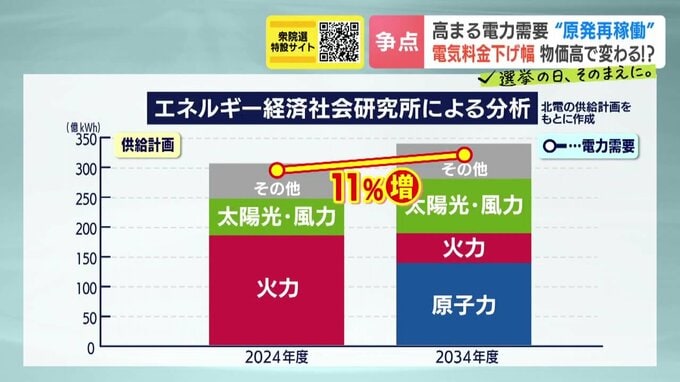東京のシンクタンクの分析によると、ラピダスや新しく進出したデータセンターが稼働した場合、北海道内の2034年度の電力需要は2024年度と比べて約11%増加。