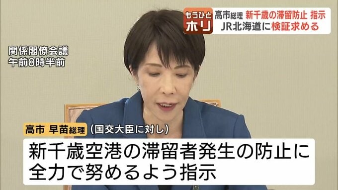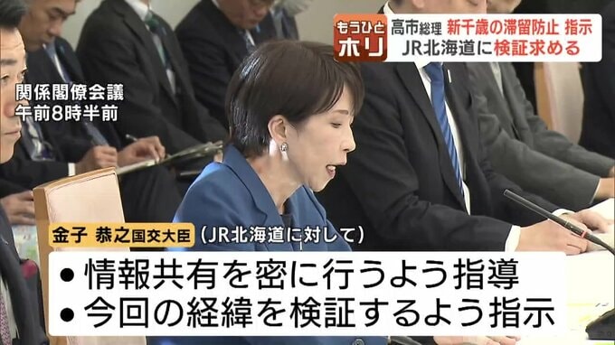 高市総理大臣は、3日朝の関係閣僚会議で、大雪の影響で、JRのダイヤが乱れ、新千歳空港に滞留者が出たことについて、こうした事態の防止に全力で努めるよう、金子恭之国土交通大臣に指示をしました。その金子大臣は、JR北海道に対して、災害発生時には、関係者との情報共有を密に行うように、改めて指導すると述べました。また今回、列車の運転再開が遅れた理由や経緯などについて、検証するよう、JR北海道に指示をしたということです。