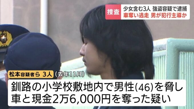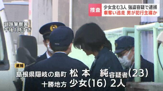 島根県の漁師・松本純容疑者(23)は、十勝地方に住む16歳の少女2人と共謀し、2025年11月、釧路市興津の小学校の敷地内で、46歳の男性を工具で脅して、車と現金2万6000円を奪った疑いで4日送検されました。