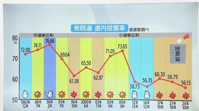 1983年から直近の選挙の投票率のグラフです。雪マークは冬、太陽マークは夏、落ち葉マークは秋です。