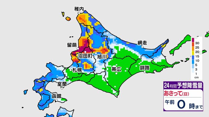 特に午後は留萌周辺から活発な雪雲が集中して流れ込み、留萌市幌糠から北空知の沼田町周辺など一気に積雪の増える恐れがあります。