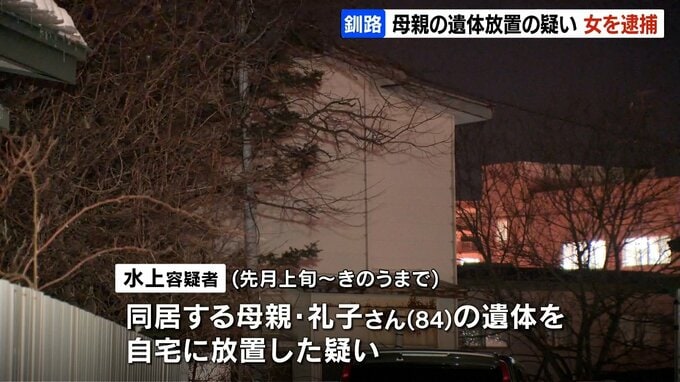 北海道釧路市の自宅に84歳の母親の遺体を放置した疑いで、6日、53歳の女が逮捕されました。