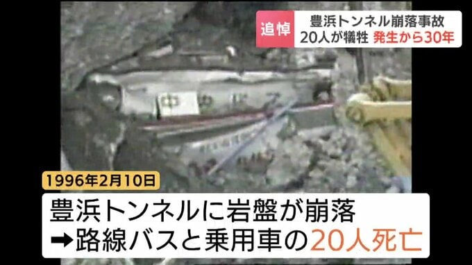 この事故は1996年の2月10日の朝、国道229号の豊浜トンネルに岩盤が崩落して、巻き込まれた路線バスと乗用車に乗っていた通学中の児童・生徒8人を含むあわせて20人が死亡したものです。