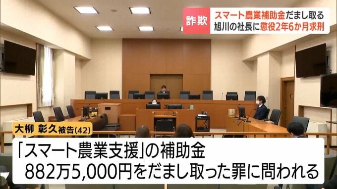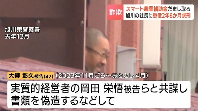 北海道旭川市の大柳ファーム社長、大柳彰久被告(42)は実質的経営者の岡田栄悟被告(47)らと共謀し、2023年11月ごろからおととし4月にかけて、書類を偽造するなどして農水省のスマート農業支援の補助金882万5千円をだまし取った罪に問われています。