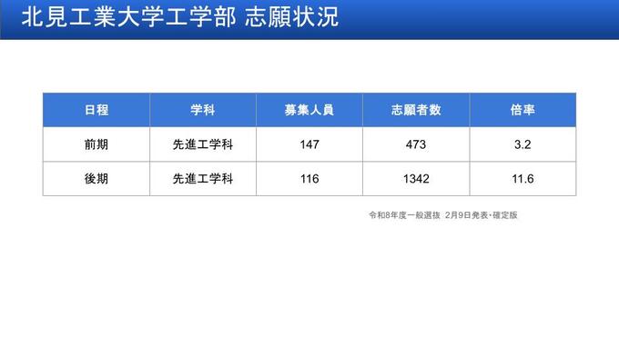 北見工業大学 志願状況2026 一般選抜【確定】工学部の倍率は前期3.2倍、後期11.6倍 2026年2月13日(金) 16:05 国内 北見工業大学の一般選抜(一般入試)について、確定した志願倍率が公表されました。 工学部先進工学科は、前期日程で147人の募集に対し473人が出願していて、倍率は3.2倍、後期日程で116人の募集に対し1342人が出願していて、倍率は11.6倍です。
