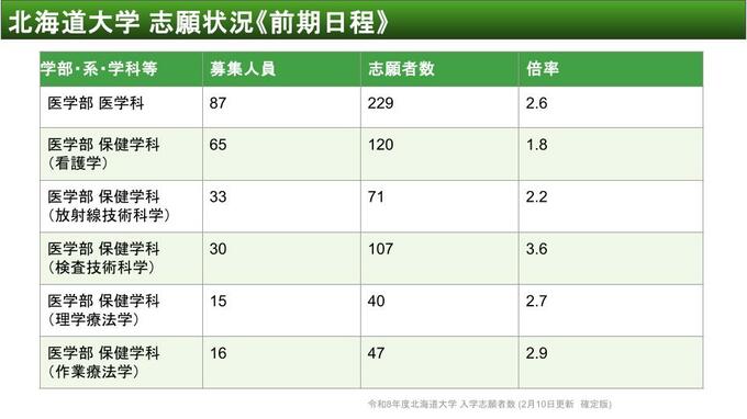 医学部・医学科は、87人の募集に対し229人が出願していて、倍率は2.6倍です。